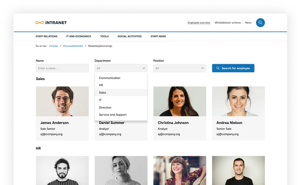 Søg efter medarbejdere og sorter efter navn, placering eller titel.
