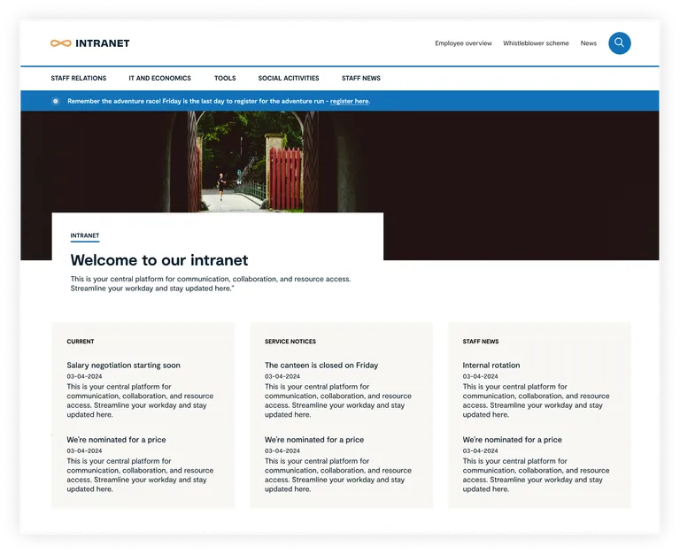 Når der skal opbygges et nyt intranet, er der allerede en intranet-skabelon klar til at tage udgangspunkt i. Dette gør det nemmere og hurtigere at bygge intranettet og let efterfølgende at tilpasse specifikke behov.